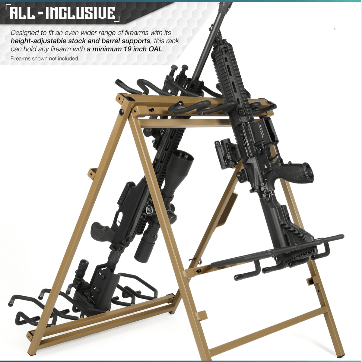 Holds Up to 9 Firearms of Various Sizes: The Shorty Rack of 9 is built to hold a variety of firearms, from AR pistols to pistol caliber carbines and SBRs. It securely fits up to 9 rifles or long guns with a minimum overall length of 19 inches, making it perfect for a mixed tactical lineup.